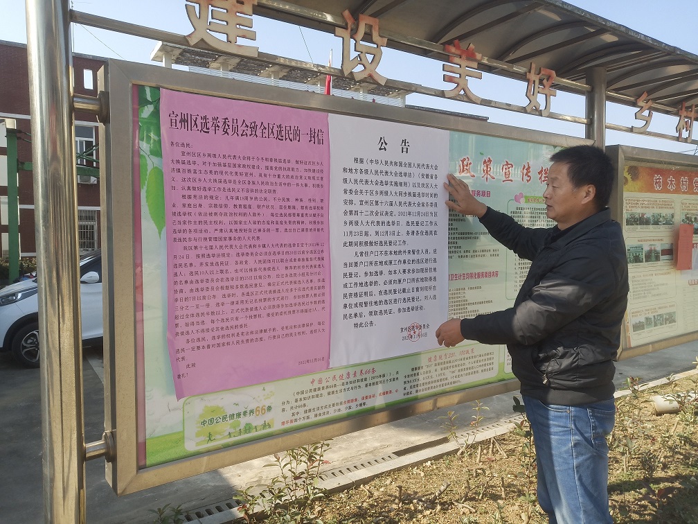 一是张贴公告。按照全镇选区全覆盖的要求,张贴50份《宣城市宣州区选举委员会公告》和《致全区选民的一封信》,提高广大干部群众对区、镇两级人大换届选举的认识。